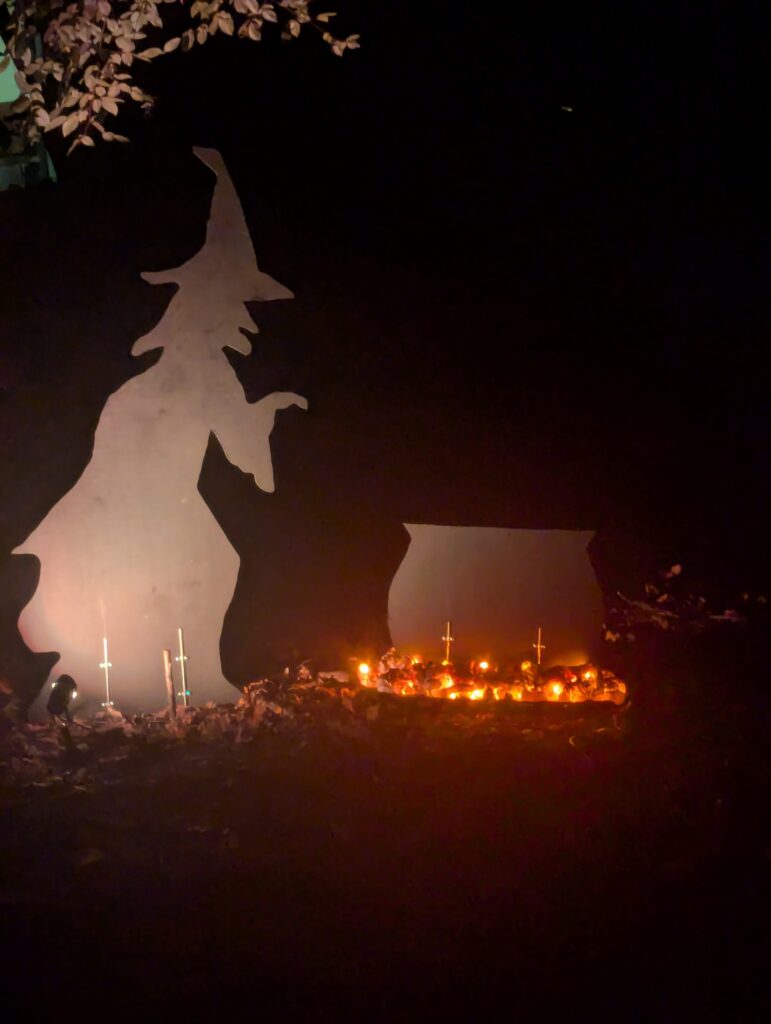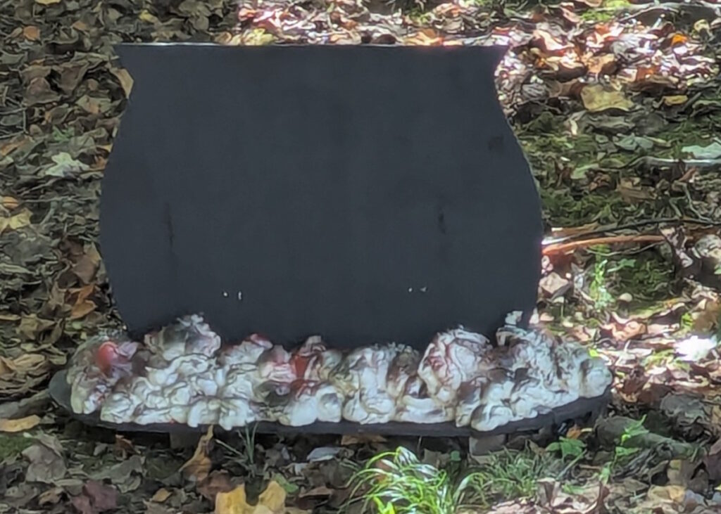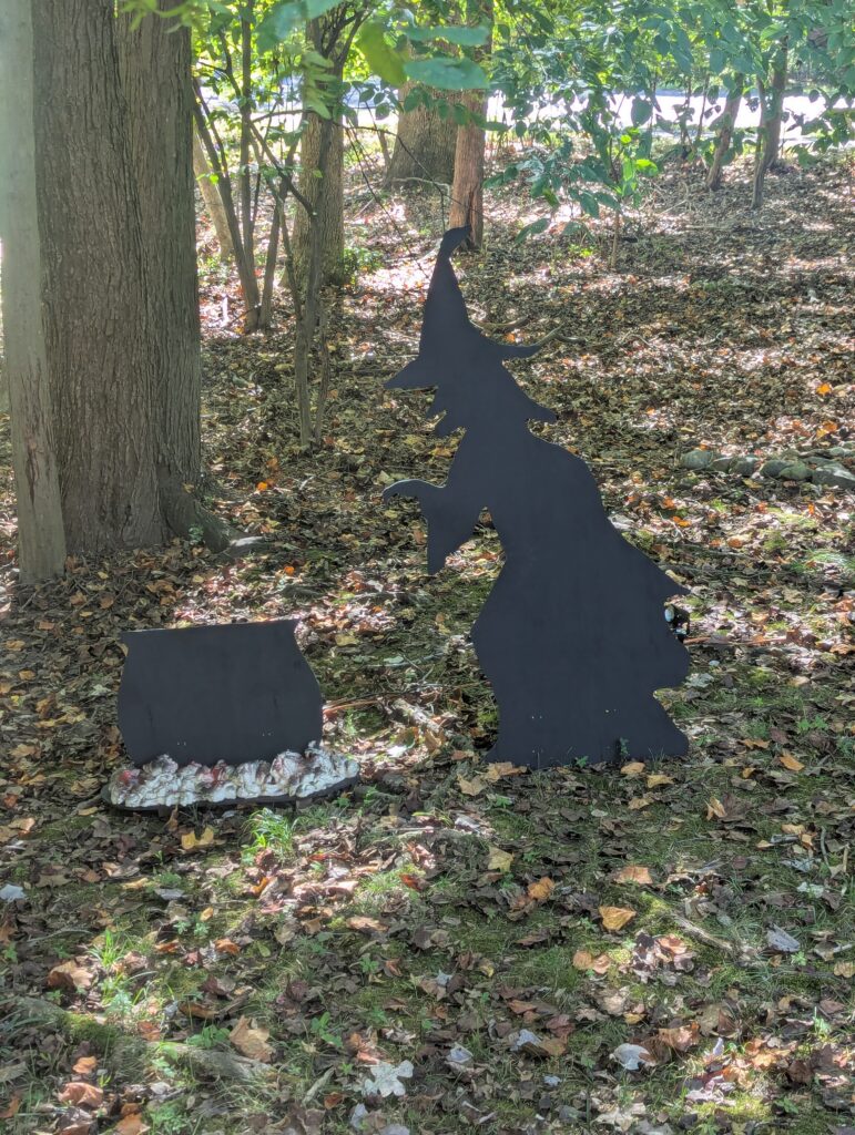 We have a set of plywood bear silhouettes set up in our backyard for most of the year, visible from our house and from the street through the woods. This year, I decided to make a Halloween scene to replace them when they first go into hibernation for the fall and winter. The bears would be replaced with a witch and her cauldron, and there would be artificial lit coals under the cauldron.