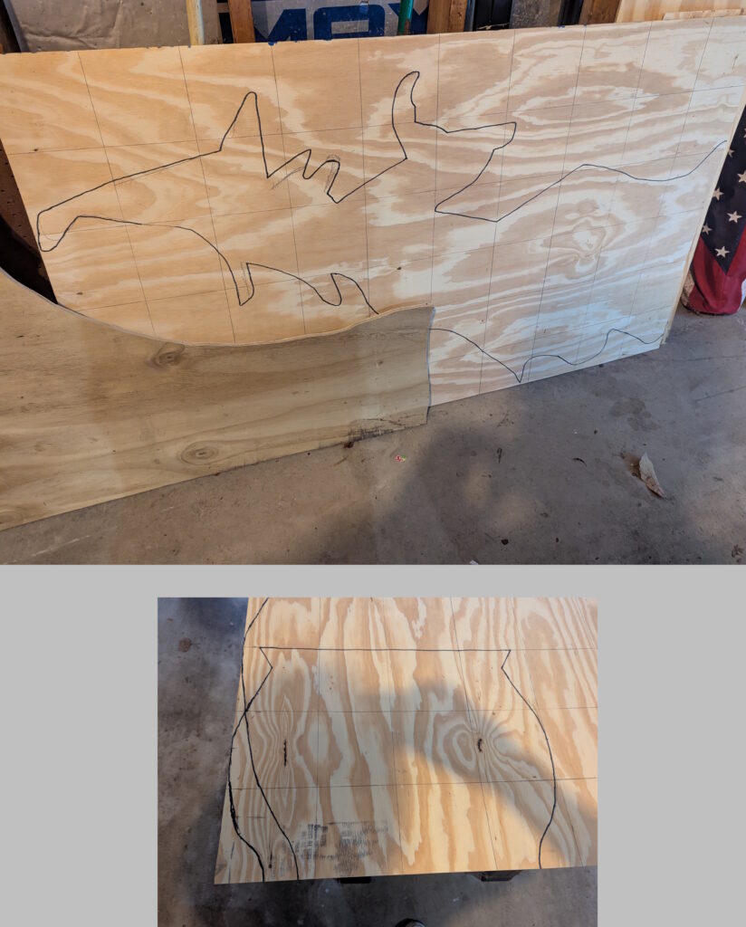 The purpose of the scaling lines was to make it much, much easier to freehand layout the full-size pattern on the plywood. I went from where each line in the outline crossed a scaling line to the next scaling line, hand-drawing in each segment. Once the pattern was drawn on the plywood at scale, I cut both the witch and the cauldron out using a jigsaw.